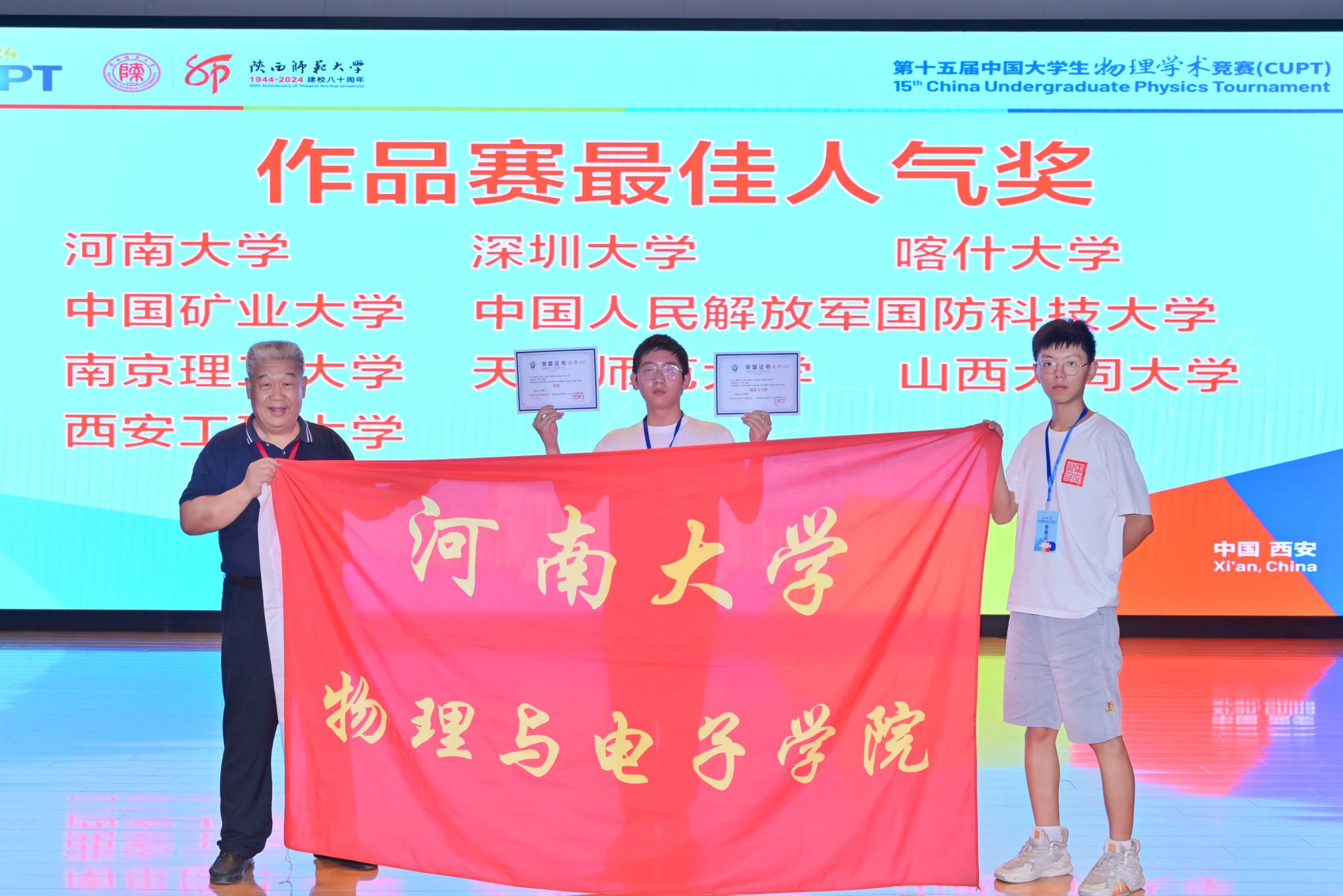 2024年中国大学生物理学术竞赛采用IYPT2024题目,由10名专家组成的作品赛裁判组,以现场讲解和答辩方式评出一二三等奖,其中一等奖7名;最佳人气奖是由参加团体赛的68支队伍对作品赛海报进行投票选出。能同时获得一等奖和最佳人气奖,充分展示了spbo完场比分