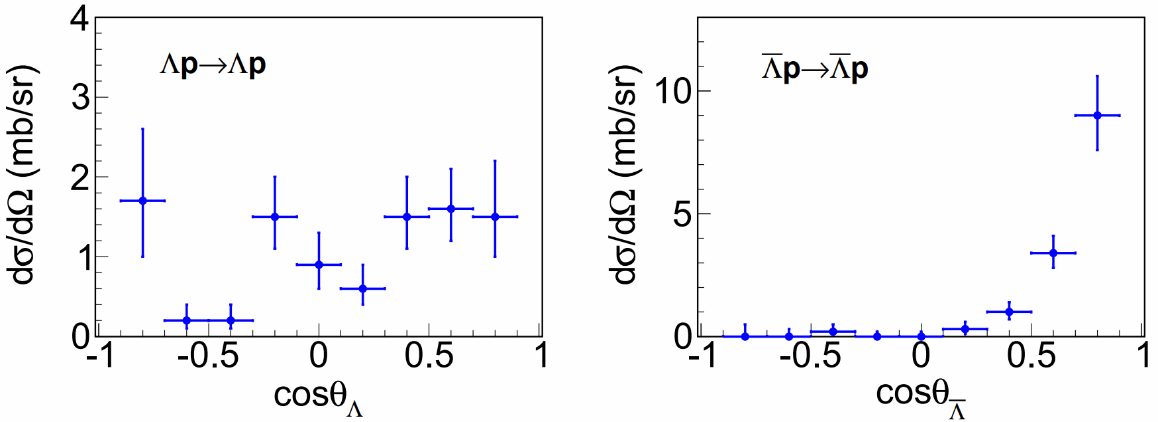 图1:反应过程Λp→Λp(左图)和Λ-bar p→Λ-bar p(右图)的微分散射截面。