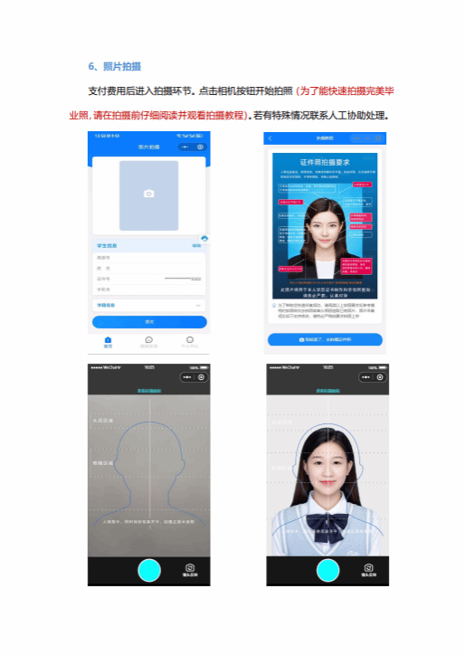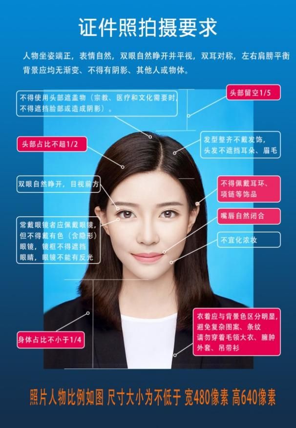 (四)学生在图像采集时务必真实表达本人相貌,请勿画浓妆和美颜,尽量使用手机自带相机拍摄或到照相馆照相后在线提交,禁止对图像整体或局部进行镜像、旋转等变换操作,不得对人像特征进行修饰处理,不得添加边框、文字、装饰图案等其他内容。图像信息须正面免冠照,禁穿蓝色衣服(背景为自动生成天蓝色),具体要求见下图。