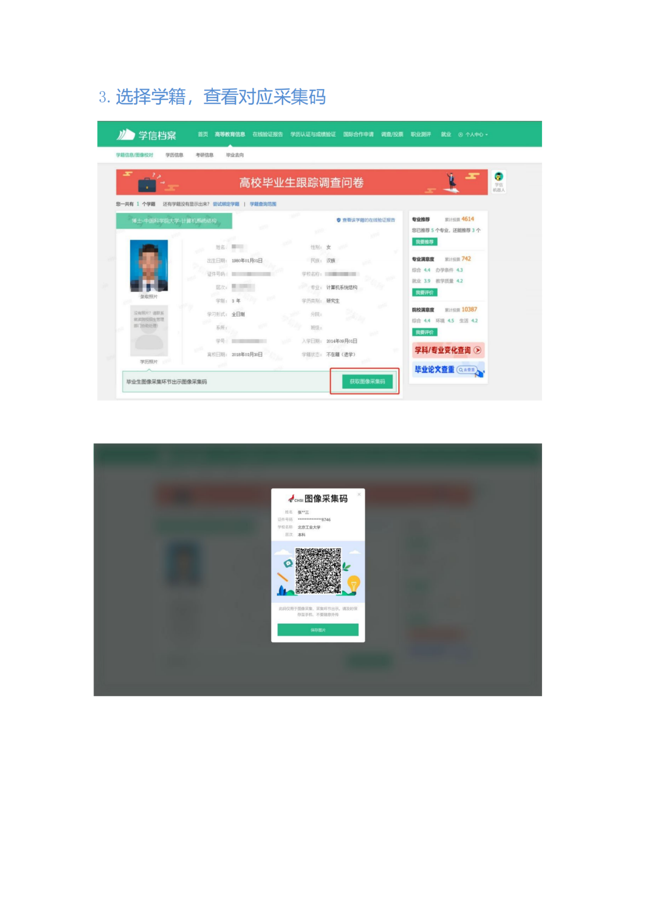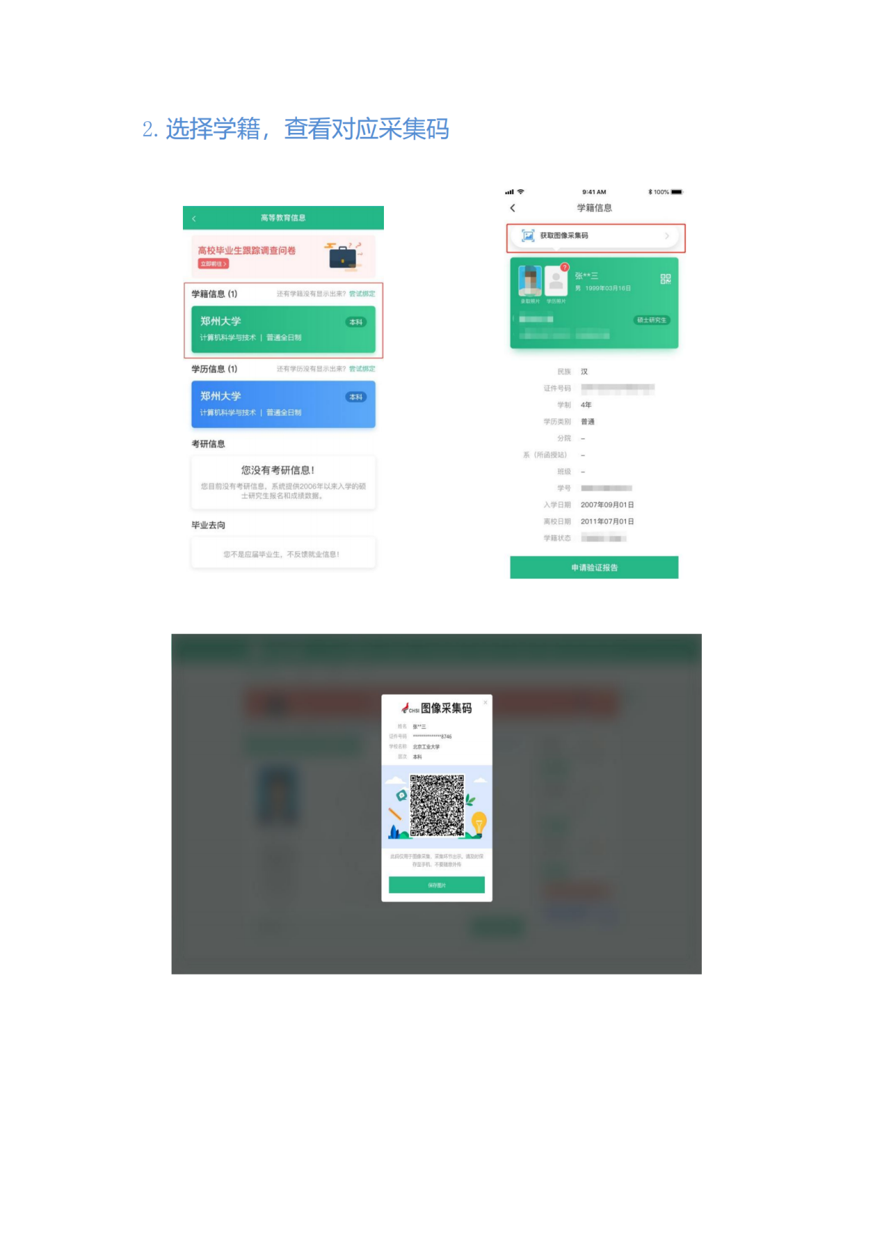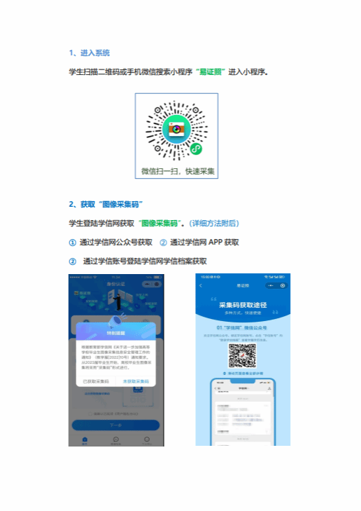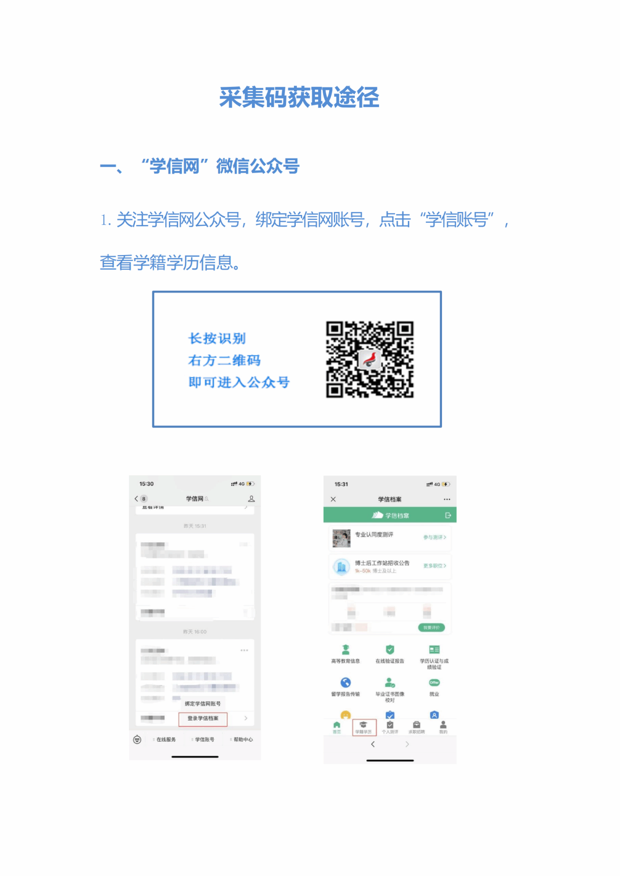 (一)为切实保障毕业生信息安全、保护学生隐私、优化图像采集工作流程,自2023届毕业生开始,教育部学信网开始启用“基于采集码”的图像采集新模式,学生在进行采集时需要先在学信网下载“采集码”(获取方法见附件1)后再采集图像。