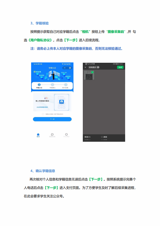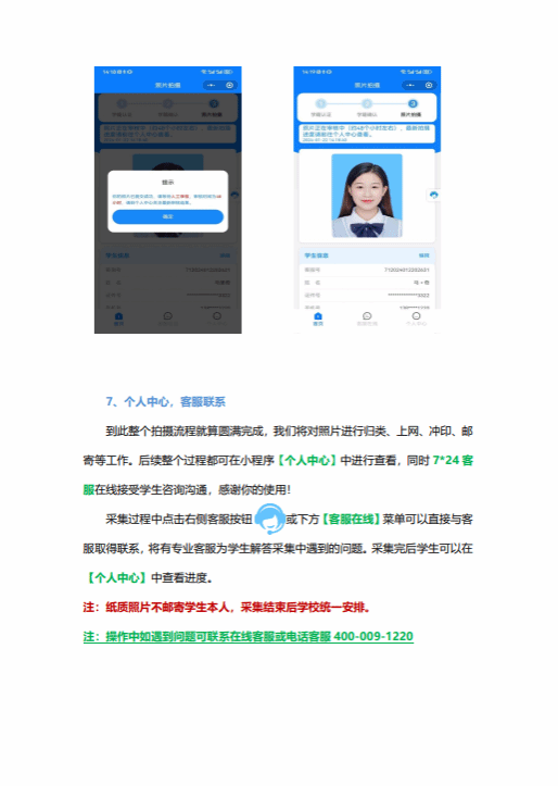为了保证采集效果,请同学们务必按有关规定和要求进行图像信息采集,学生采集过程中如有问题,请在线或电话联系采集单位客服,电话400-009-1220。
