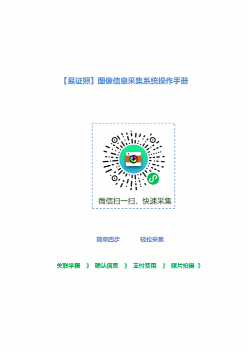 (二)学生通过微信扫描“易证照”二维码或微信搜索“易证照”小程序按规定流程进行操作(具体操作流程见附件2)。学生提交毕业生图像信息后请及时关注审核结果通知,如审核未通过,请按要求改正问题后,继续提交标准照片,直至审核通过即采集成功。