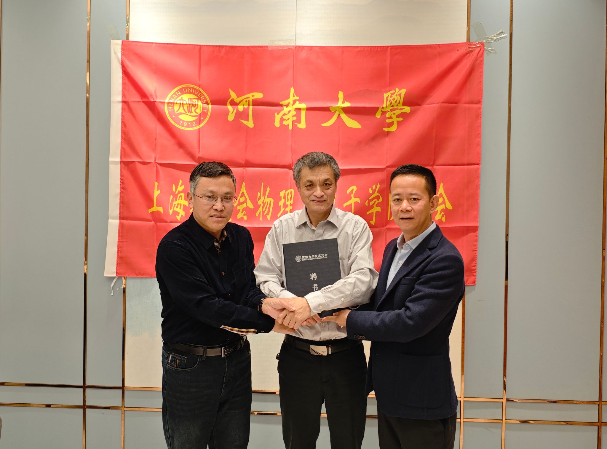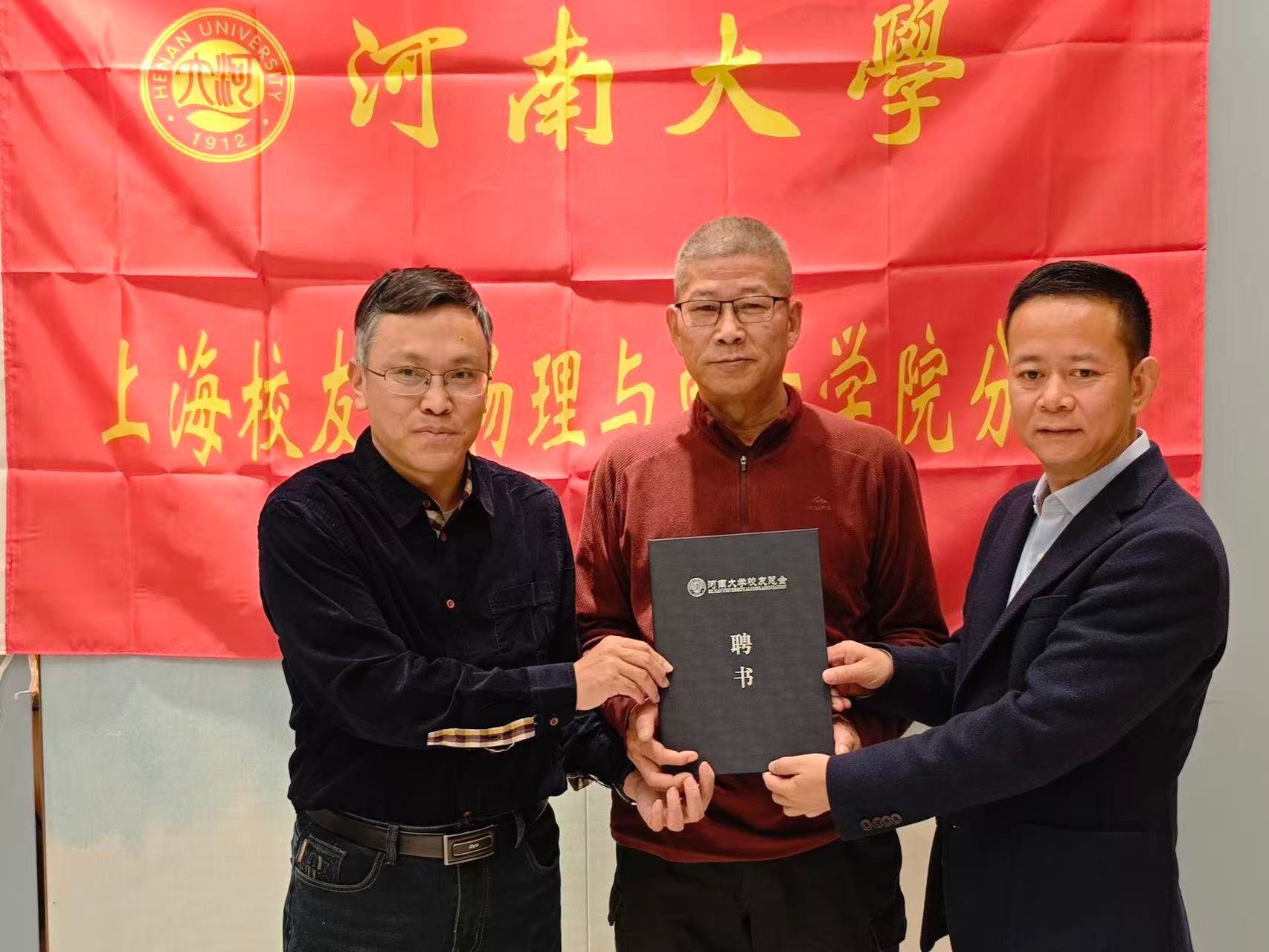 领导为名誉会长及新一届理事成员颁发聘书,并向分会授予了“河南大学校友物理与电子分会”会旗。