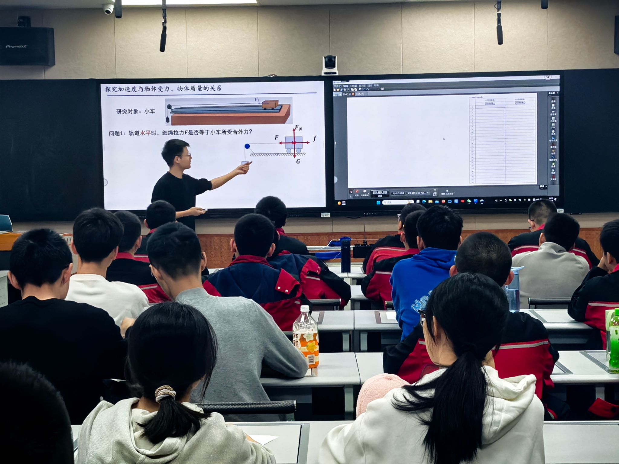 雄厚的科研实力与先进的实验设备,为中学生精彩演示了平抛运动、光的干涉衍射、牛顿第二定律验证及电源内阻测量等系列数字化实验。为使科研与教学深度融合,活动还设置了严谨的前后测问卷调研,通过对比学生实验前后的认知变化,为探究数字化实验的教学效果积累了宝贵的一手数据。