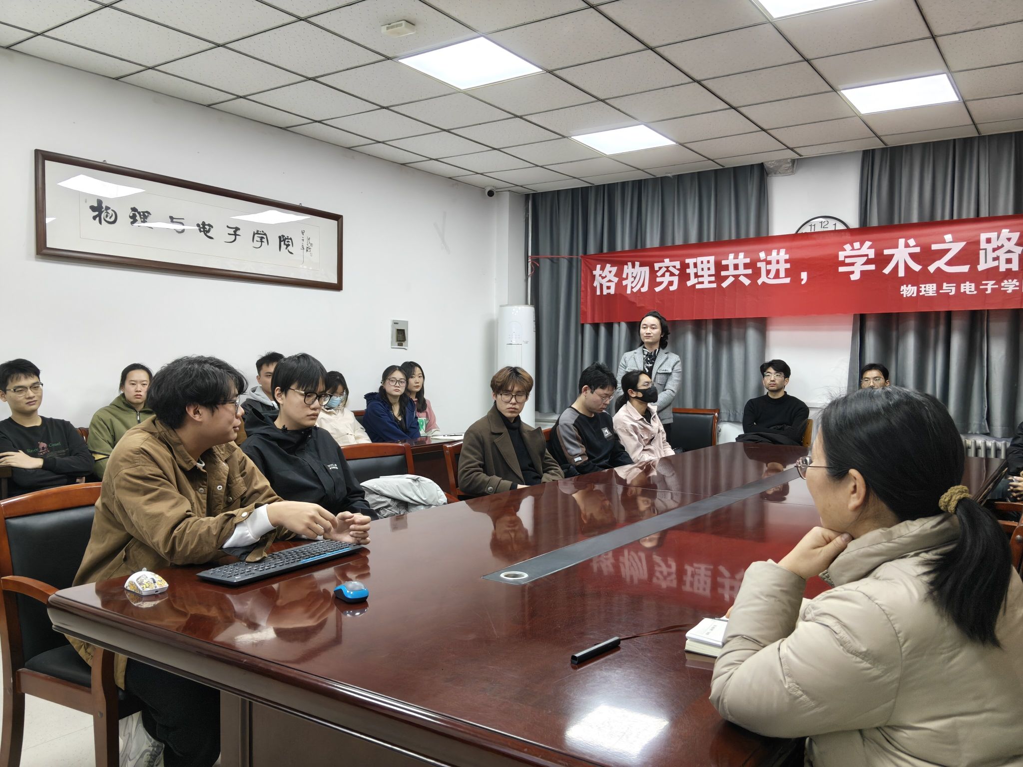 于物理楼A311举办2025年“学术之路”系列讲座——“格物穷理共进,学术之路同行”第二期学术分享交流会,邀请国家奖学金获得者陈禹豪做经验分享,研究生辅导员王翠苹主持会议。