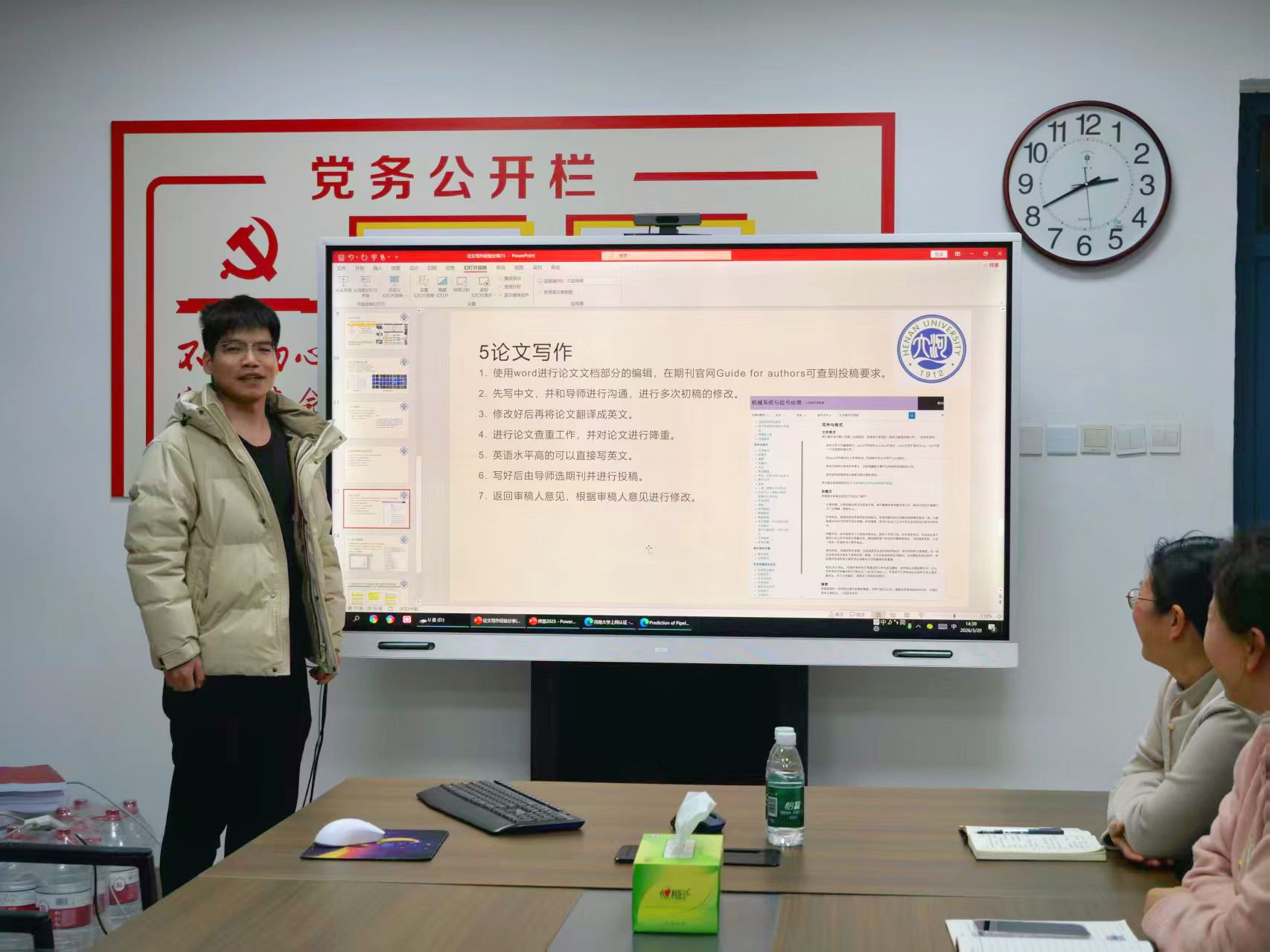 陈聪结合自身投稿实践经历,围绕文献检索、论文撰写、投稿与返修三个核心环节展开分享。在文献检索方面,建议优先检索顶级期刊文献;论文写作遵循 “引言 — 相关工作 — 研究方法 — 实验分析 — 结论与讨论” 的规范结构,着重强调创新点的提炼与呈现;期刊选择则需重点关注收稿范围与学科匹配度、审稿周期及影响因子与分区变动情况。最后,他还向在场师生推荐了相关学术资源网站,并现场演示了文献检索的具体操作流程。