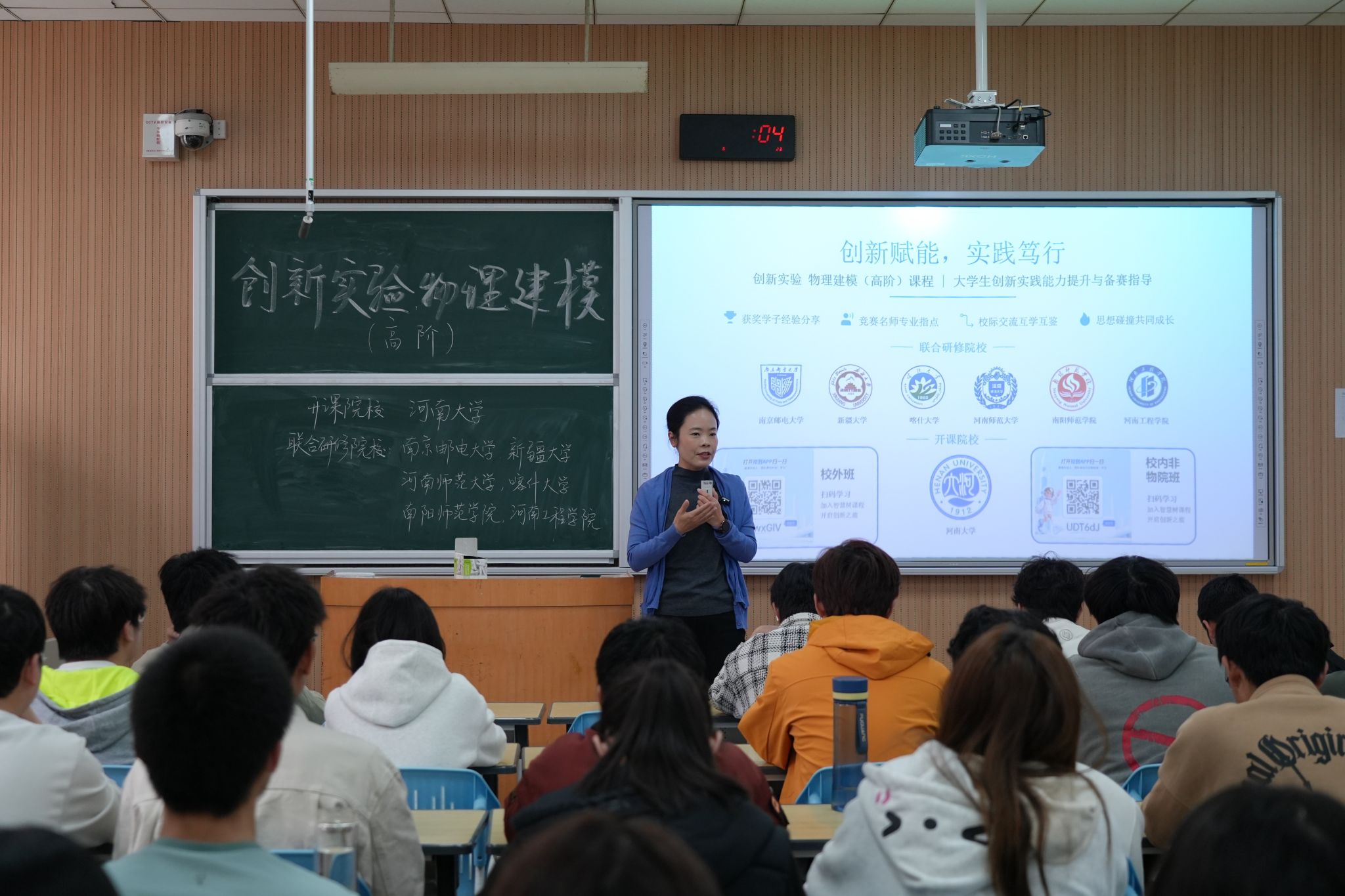 为深化教学改革、强化竞赛育人的针对性和持续性,搭建东、中、西部高校间的学术交流桥梁,3月26日,以“创新赋能,实践笃行”为主题的河南大学《创新实验物理建模(高阶)》首场跨校直播课在金明校区综合楼5104教室顺利开讲。讲座以线下授课+线上直播的形式进行,河南大学物理与电子国家级实验教学示范中心副主任魏凌教授主持讲座。