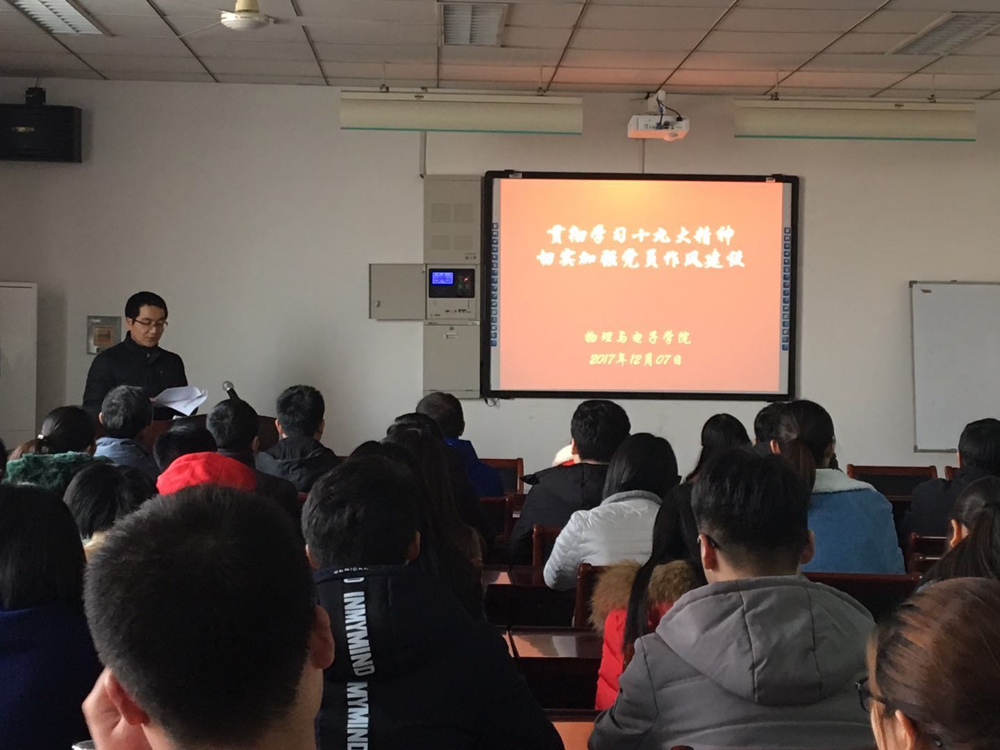 王宏华在总结时表示,学习党的十九大精神,是当前和今后一个时期的首要政治任务。要把学习党的十九大精神落实到具体的工作上来,紧紧围绕学校“一条主线、两项工程、三项基础保证”的工作思路,与“两学一做”常态化教育、“不忘初心  争创一流”专题研讨和spbo完场比分 “十三五”发展规划以及spbo完场比分 优势特色学科建设结合起来,脚踏实地、砥砺前行,努力打造物理学科,促进一流学科建设,为学校一流学科大学建设作贡献。