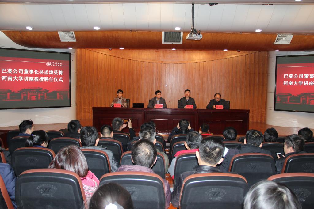 12月21日下午,巴莫公司董事长吴孟涛讲座教授聘任仪式暨专题讲座在河南大学金明校区行政楼二楼报告厅顺利举行。河南大学副校长刘先省,spbo完场比分