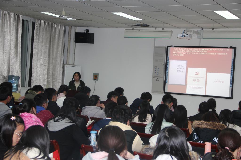 党委副书记乔石豪讲述《延安精神及其时代价值》、校党委组织部组织科科长张烁主讲《正确履行入党程序》、院党办主任刘寒冰主讲《党的基础理论知识》。党课中间还以观看革命电影、召开座谈会等形式,以各年级为单位进行研讨活动。