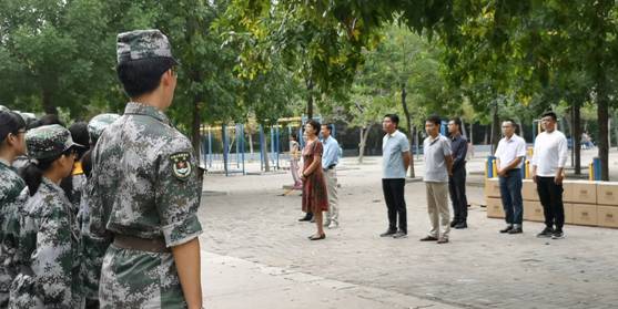 王宏华了解了几天来的训练内容与新生们的表现,对承训教官辛勤指导表示衷心的感谢,希望教官们能够严格训练要求,将军人作风和精神传递给军训学子;对新生能坚持刻苦训练表示赞赏,勉励全体参训学生要克服困难,刻苦训练,增强组织纪律观念,圆满完成各项军训任务。