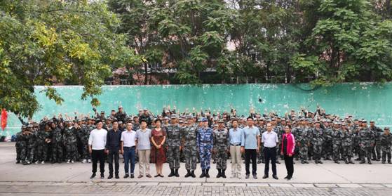 党政领导班子、全体辅导员来到新生军训现场,亲切看望慰问承训教官与正在参加军训的2019级新生,为他们送上节日的祝福。