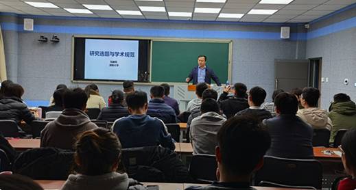 湖南大学马建民副教授首先做了“高质量学术论文撰写与学术规范”的专题报告。他结合自己的科研生活,详细论述了研究选题创新和内容真实的重要性。他强调:学术研究要良心做人,良心做事,不做伪科研;要学以致用,研究内容要“既上书架,又上货架”。