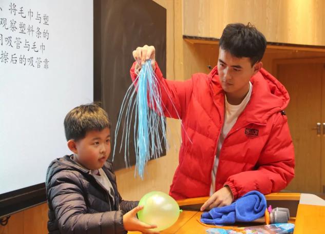 志愿者结合小学生身心成长的特点,制作了别具特色的物理小实验,为他们打开奇妙的科学探索之窗。志愿者们通过展示“小小照相机、动力小船实验、潜艇的制作实验、潜望镜观察实验、非牛顿流体实验、静电现象、水的表面张力、大气压强、陀螺仪、重力重心、光、水”等一系列具体生动有趣的实验,介绍了包括“附壁效应、压强、小孔成像、非牛顿流体、静电现象”在内的多个物理现象或名词,深入浅出的讲解了生活中常见的物理知识,有意识的引导小学生联系生活实际分析物理现象,使孩子们在好奇和实践中逐渐培养物理学习兴趣。