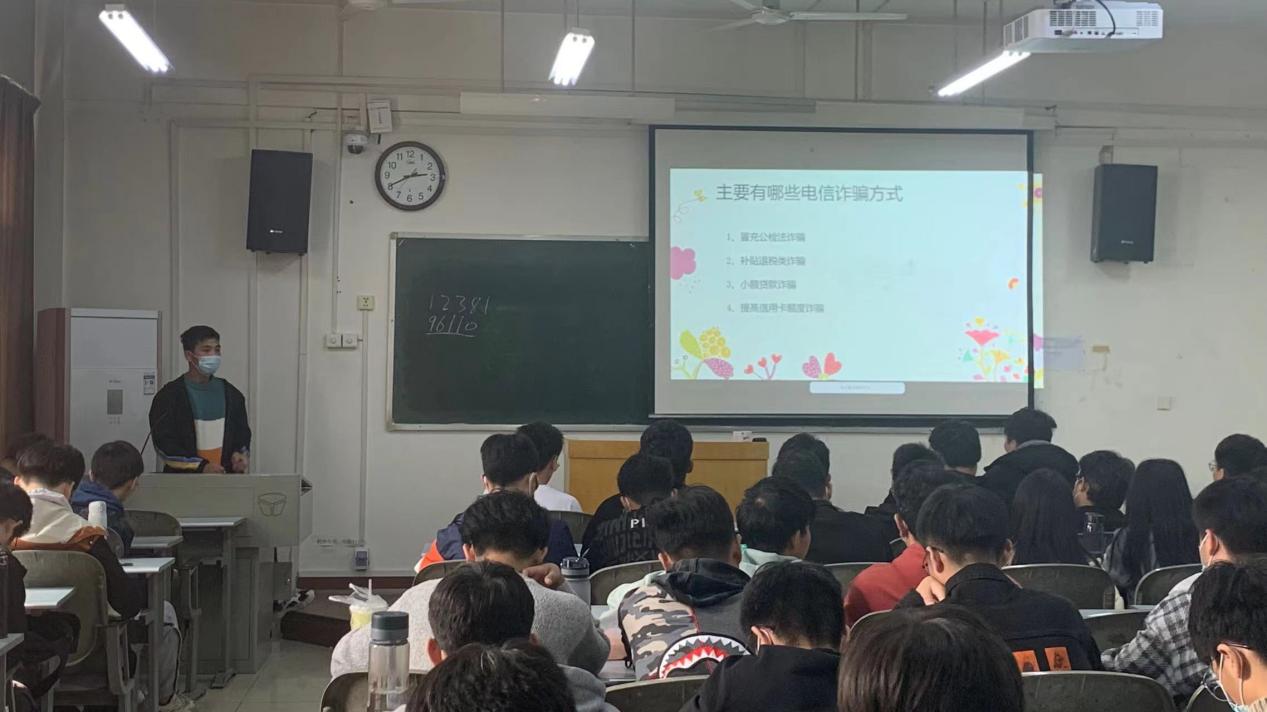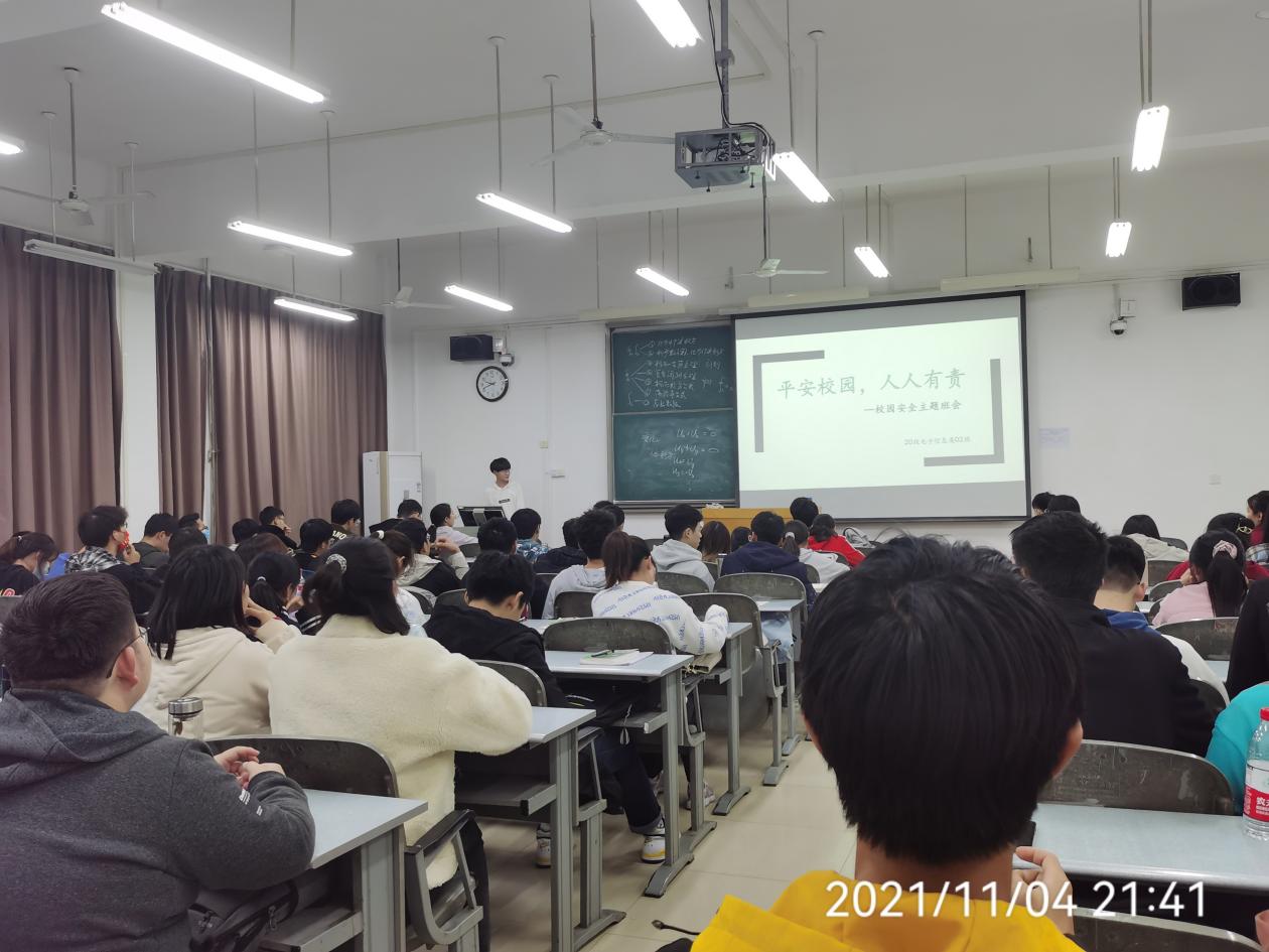 本次主题班会就疫情防控、校园交通安全、财产安全、用电安全、防诈骗等五个方面进行相关讲解,指出了校园安全隐患,告诫同学们,自己独自在外,要维护好个人生命财产安全。正值疫情防控期间,各班班委向大家科普了密切接触者的概念、口罩佩戴的方法等知识;注意交通安全,遵守交通规则,尤其是住在校外宿舍的女生,更要关注自身安全,过马路时,注意来往行人车辆,切忌玩手机;在学生寝室不使用大功率电器,插线版和电源适配器附近不能堆放杂物;保护好个人信息,谨慎对待来历不明的短信和电话,不打开不明链接,防止受骗等。最后,辅导员刁春丽老师再次强调了安全问题的重要性,要求同学们在保障安全的前提下,重视学习,提高课堂学习效率,积极参加课外活动,过一个充实的大学生活。本次班会通过现实中的例子提醒同学们要重视校园用电安全,随时关注宿舍防火和食品安全等问题;同时也列举了校园中网络诈骗的具体行为,现身说法,让同学们对这些问题有了更深入的了解和更深刻的体会。