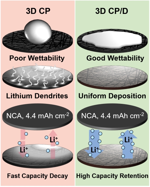 与低亲锂性的三维碳纸材料相比,高亲锂性的三维碳纸材料可以显著提高电池体系的电化学性能(图1)。通过增加亲锂活性位点来抑制锂枝晶的形成,有利于锂离子在电极表面的沉积/脱出,进而诱导锂离子的均匀输运,使得锂离子在复合负极表面沉积均匀。此外,复合负极在界面处形成稳定的SEI膜,使得电池的循环稳定性进一步得到提升。因此,亲锂的复合负极材料为未来金属锂负极的大规模应用提供了新的策略,并可推广到更高能量密度的Li-S、Li-O2电池等其他二次储能体系。