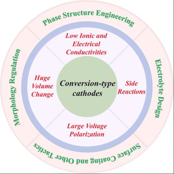 正极材料的能量密度是决定锂金属电池性能的关键。相比于传统嵌入型正极材料,虽然转换型正极材料的工作电压偏低,然而它们的理论比容量远大于嵌入型正极材料,所以这些转换型正极材料具有更高的能量密度,极具应用前景。但转换型正极材料面临着电子/离子电导率低、体积变化大、反应动力学缓慢、工作机制复杂、副反应严重等问题,严重阻碍电极材料高效稳定快速储锂。