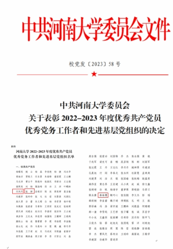 党委荣获河南大学“先进基层党委”,物理实验中心教工党支部、电工电子实验中心教工党支部荣获“先进党支部”,吴坤荣获省级优秀共产党员,任凤竹、张婷、秦海鹰荣获河南大学优秀共产党员,康缈荣获河南大学优秀党务工作者。