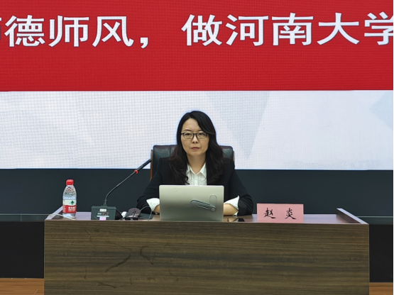 赵炎以“树良好师德师风,做河南大学好老师”为主题,对标“教育家精神”,从“师德师风的重要性”“高校师德师风规范要求”和“做什么样的好老师”三个方面深入剖析了师德建设的宏观背景和新时代高校师德建设的形势与任务。对师德师风建设的相关文件规定进行了深入解读,结合近年来教育部公开曝光的高校师德失范典型案例,政策引导与警示教育相结合,进一步明确了高校教师师德建设的规范和遵循,阐释了修身养性、涵养师德的途径与意义。她指出,要坚持对师德违规问题“零容忍”,严格落实“一票否决”制,常抓不懈落实落细各项工作任务。