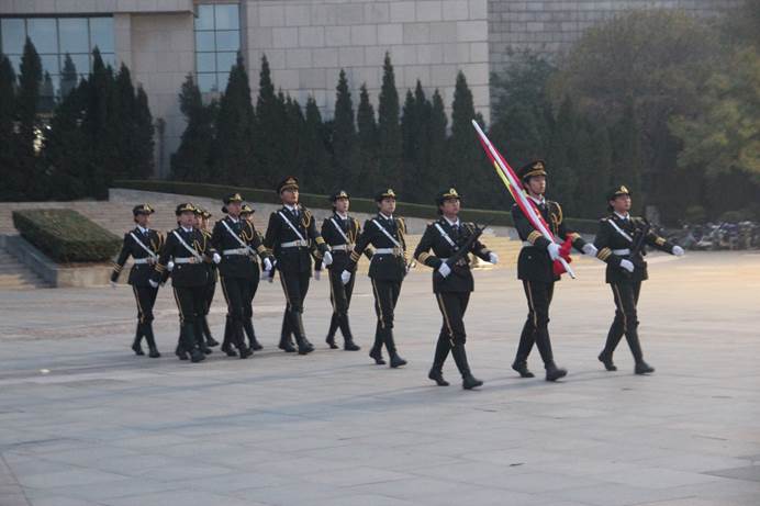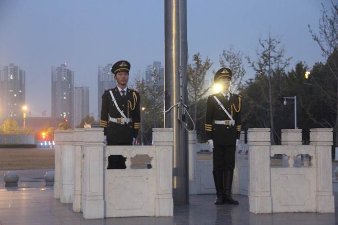 东方欲晓,晨光初露。6:15,我校国旗护卫队队员们迈着矫健的步伐护送国旗走向升旗台,全体师生肃立注目,五星红旗在庄严的国歌声中冉冉升起。