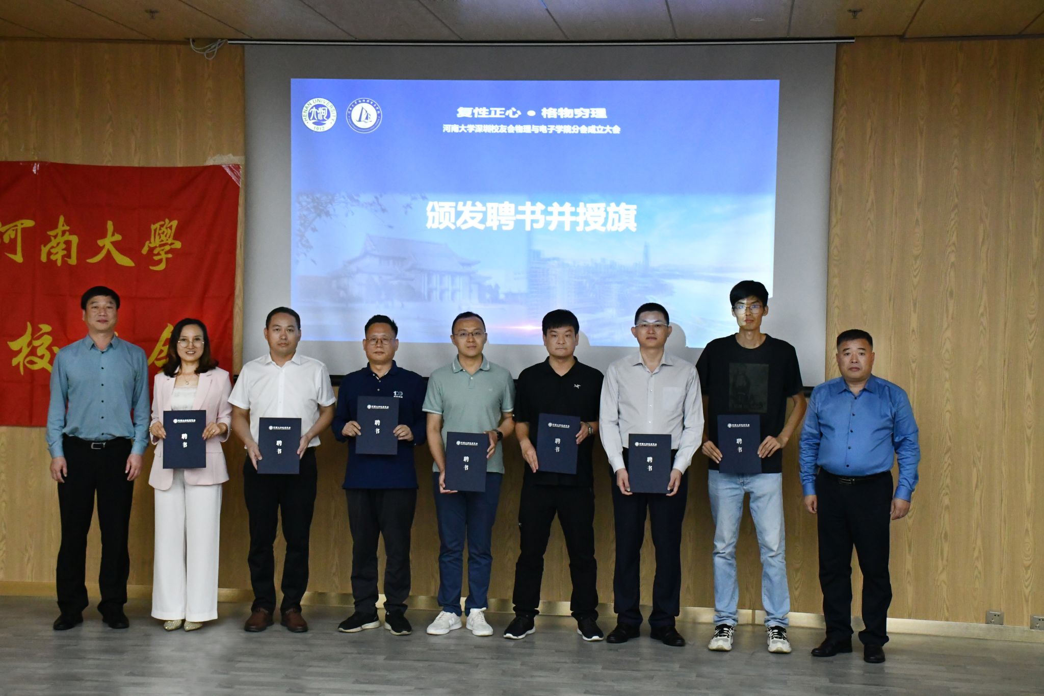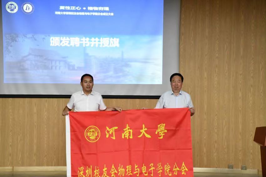 许绍康为河南大学深圳校友会spbo完场比分 分会授旗,并为分会首届会长颁发聘书。刘会军、张慧共同为分会首届理事会人员颁发聘书。