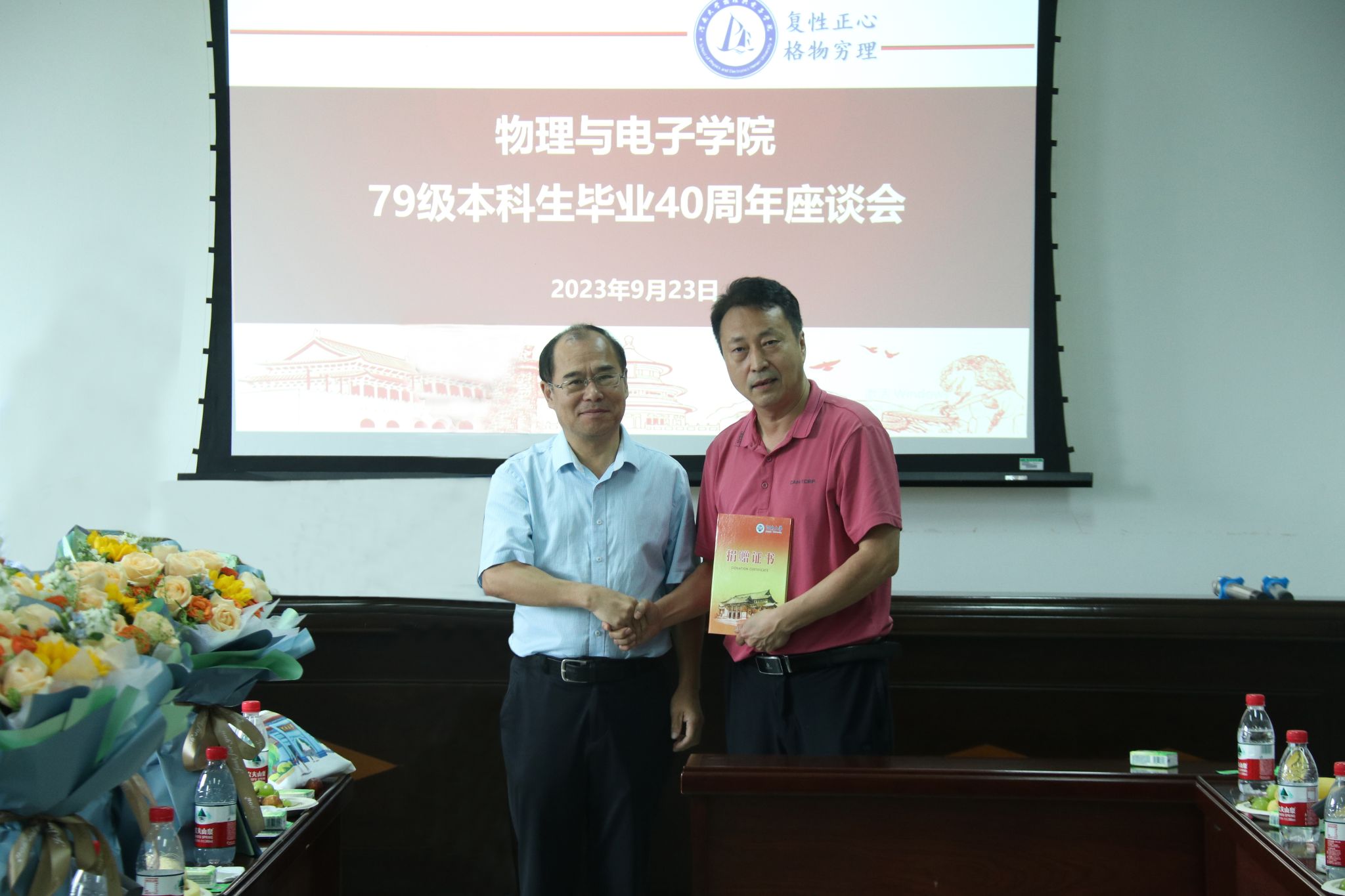 下午,刘寒冰还与同期返校的09级年级长王群等同学交流座谈、接受捐赠并合影留念。