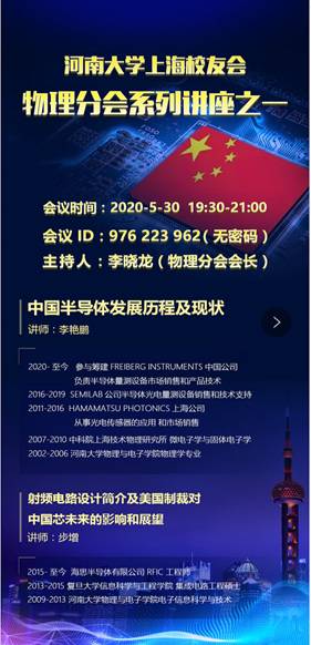 2020年5月30日晚上,河南大学上海校友会物理与电子分会通过线上视频会议的方式,举办了以“中国半导体发展历程及现状”、“射频电路设计简介及美国制裁对中国芯片未来的影响和展望”为主题的讲座。讲座由物理与电子分会会长李晓龙主持,130余位校友参加。