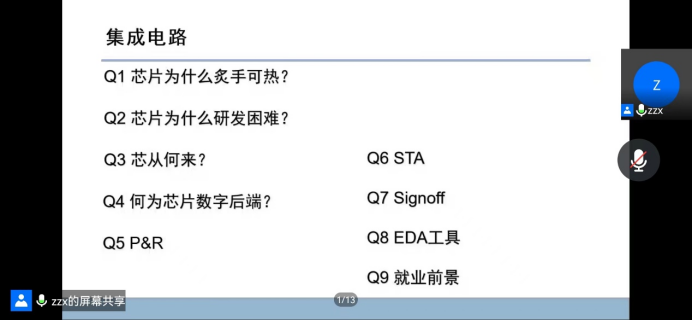 邀请2010级电子信息科学与技术专业校友周朝旭博士通过线上视频会议的方式,为2020级学生作关于芯片领域职业划分及物理实现技术介绍分享报告,2020级辅导员刁春丽老师主持报告会。
