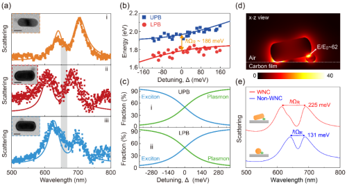 实现确定性单激子与单纳米颗粒光子模的室温量子强耦合是一个尚未解决的难题。为解决这一问题,刘仁明教授与中山大学王雪华教授团队合作,利用分子耦连技术和光照光力吸引原理将单个壳层量子点链接到单金纳米棒端部电场最强的热点位置。当该耦合系统与碳薄膜衬底形成“楔形腔”构型时,光场能够被更加有效地“拉入”并局域在量子点激子所在的壳层,显著增强激子与光子的相互作用、从而克服室温下的巨大耗散。结合暗场散射光学测量与冷冻电镜断层成像技术,确认在常温常压下实现了单量子点与单个金属纳米棒光子模的量子强耦合,观测到了迄今为止单激子强耦合系统散射光谱的最大Rabi劈裂(~234 meV),为规模化制备室温固态单量子比特开辟了一条可行的路径。