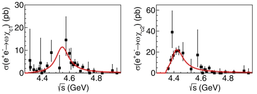 图1e+e-→ωχc1(左图)和e+e-→ωχc2(右图)截面的拟合结果,两个显著的结构被观测到