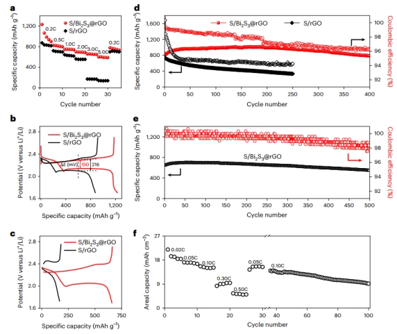 根据上述对硫还原反应活性描述因子的认识,作者选择了Bi2S3作为催化剂材料用于实用化的锂硫电池。通过与石墨烯复合,提高催化材料的导电性。所得到的Bi2S3基催化材料,在1C倍率下循环400圈容量保持率仍有93.6%,5C的大倍率下循环500圈时,容量单圈衰减率仅0.03%(图4a−e);将电池正极的硫面载量提高至17.6 mg cm-2、电解液/硫(E/S)降至7.5 μL mg-1时,组装的锂硫电池仍能获得21.9 mAh cm-2的超高面容量,具有超高的硫利用率(图4f)。