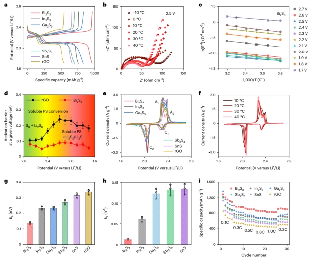 根据典型的恒电流充放电曲线和循环伏安曲线,确认了p-MS上硫还原反应的主要路径,并将高电位平台和低电位平台简化为两个总包反应过程(图1a, e)。通过对比有无p-MS催化剂添加的电池在特定放电电位下的活化能垒变化发现,两种电池在高电位平台,即由单质硫形成液态多硫的阶段,均表现出较低的活化能垒;而在2.2V之后,两种电池SRR反应的能垒呈现巨大差异,不含p-MS催化剂电池的能垒远高于初始放电阶段。因此,该电位区间对应的液态多硫转化为固态Li2S2/Li2S的反应被认为是整个放电过程中的速控步骤(图1b-d)。电池中加入p-MS催化剂后,显著降低了该阶段的反应活化能垒,这使速控步的反应速率得到了极大地提高。为了理解不同p-MS的催化性能差异,作者通过变温循环伏安测试获得了SRR速控步的表观活化能(Ea),Ea按照Bi2S3、In2S3、Ga2S3、Sb2S3、SnS的顺序依次增大。电池性能测试发现,随着Ea的减小,相应电池的多硫穿梭系数(ks,)显著降低,各个放电倍率下的电池比容量得到显著提高,且含p-MS催化剂的电池性能远高于纯rGO载体的电池(图1h, i)。