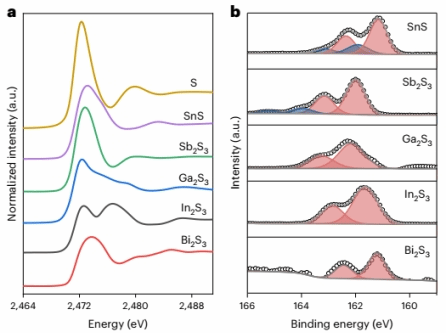 为了揭示催化剂电子结构与催化活性之间的关联,作者利用XAS和XPS分析了硫化物的电子结构。根据S K-边的X射线吸收谱分析,p区金属硫化物中金属的s(p)轨道与S的2p轨道杂化导致S电子结构的变化(图2a),并利用吸收谱的积分面积估算了p区金属硫化物中硫的p电子数增量(p电荷密度)。结合S2p和金属3d/4f的XPS谱分析,硫化物中S2p结合能向低结合能方向偏移,而金属的3d/4f峰位向高结合能方向偏移,结合能位置的相对位移与上述p电荷密度呈现相似变化规律(图2b)。