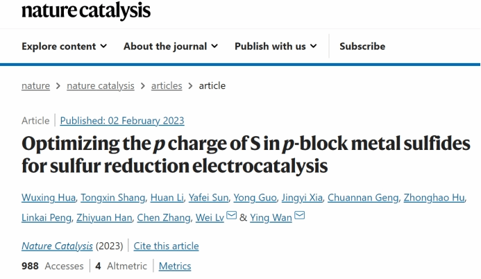 化五星博士和上海师范大学万颖教授团队、清华大学深圳研究生院吕伟副教授团队等合作,在Nature Catalysis上以Article形式发表了题为Optimizing thepcharge of S inp-block metal sulfides for sulfur reduction electrocatalysis的研究成果,将实验可测量的p电荷密度作为描述因子用于筛选高活性锂硫电池催化剂。