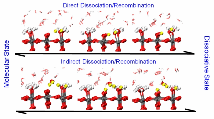 深度学习方法应用到能源材料研究近年来得到了广泛关注,为材料模拟和理论计算提供了新的思路和方法。闻波团队利用深度神经网络对第一性原理模拟的计算结果进行了学习和训练,成功得到了可重复第一性原理计算精度的经典分子动力学模拟势函数。该深度势函数具有第一性计算的精度,兼具经典模拟的效率,在长时间、大尺度模拟中具有良好潜力。团队将训练得到深度势函数应用到4-16层二氧化钛模型中,经过大约25纳秒的模拟,发现部分水分子在没有缺陷的金红石表面发生了分解。通过分析较厚层数的分解情况,发现完美表面水分子分解的比例约为22±6%,相关理论模拟结果与最新的实验结果相匹配,充分验证了本研究得到的深度势函数具有优异的可靠性和扩展性。此外,团队还系统研究了水分子分解过程中的质子传输机制,研究发现质子的传输路径主要分为直接传输和间接传输,且两种路径之间可相互衔接,在分解过程中质子传输产生的表面羟基平均寿命约为7.6±1.8纳秒。这一研究工作发现了传统第一性计算中模拟尺度难以观测到的反应过程和机理,为复杂体系深度势函数的构建与应用提供了系统性的研究方法。
